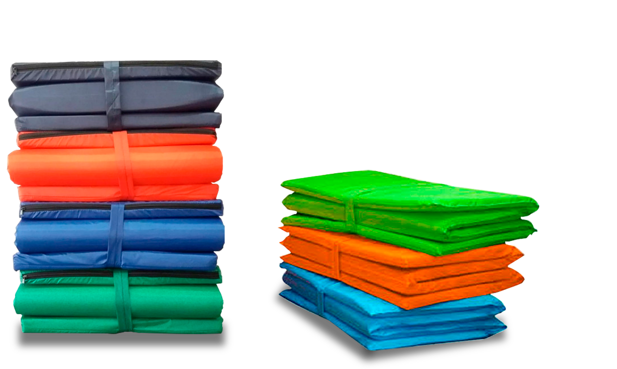 Colchonetas Camping de 60 x 180 y 100 x 180, variedad de colores, elaborada en espuma rosada. Densidad 15. Cojín Tv, elaborado en tela de satin, espuma, densidad 20 blanca.