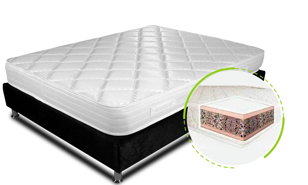 Elaborada en una base resortada con espirales en alto carbono y sus suavizantes de 5 cmt para darle más firmeza al colchón en tela acolchada satín yacar con garantía de 5 años.