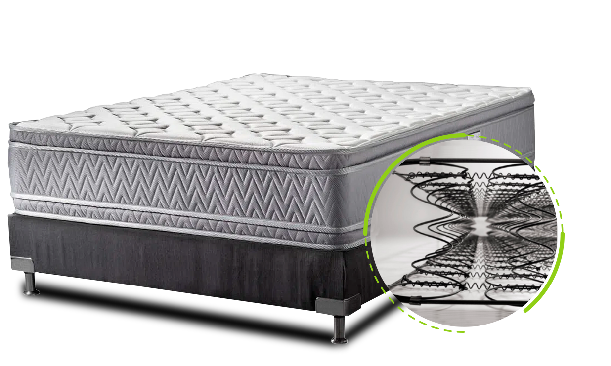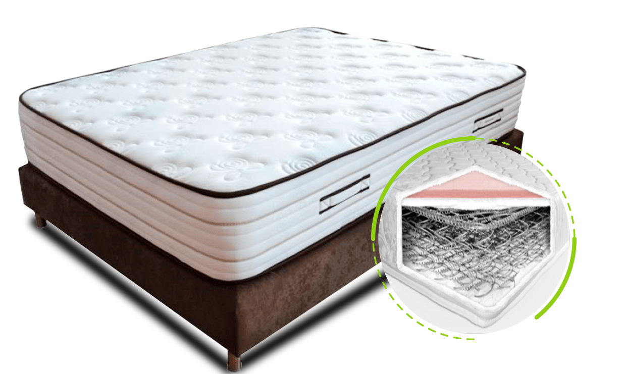 Elaborado en base resortada en alto carbono con suavizantes en DN 23 dándole una altura aproximada de 28 a 30 cm en tela yacar, garantía 5 años.